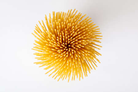 A vertical bunch of raw spaghetti tied with thread on a white plate. View from above. Italian food concept.