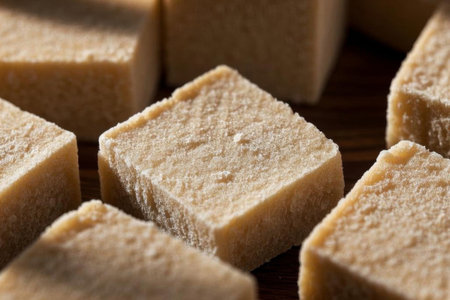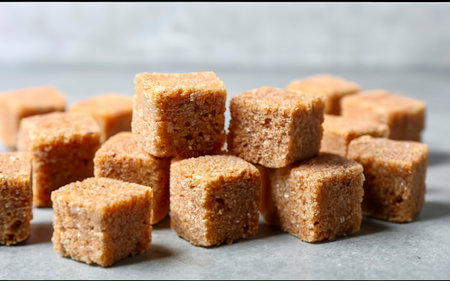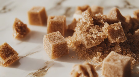Close-up image of brown sugar cubes and loose granulated sugar scattered on a smooth marble countertop, highlighting their textures and colors for culinary inspiration.