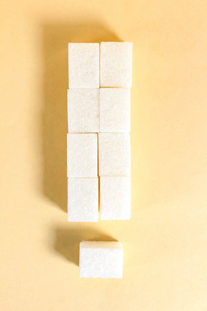 Sugar cubes in the shape of an exclamation mark on a beige background. Top view.