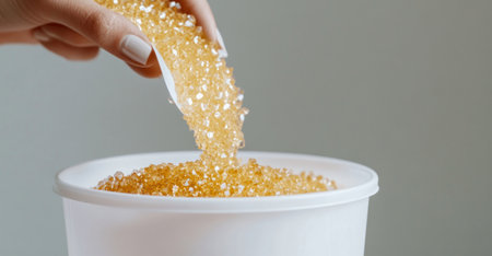 Golden sugar granules are being poured from a hand into a white container, ideal for preparing sweet recipes or desserts.