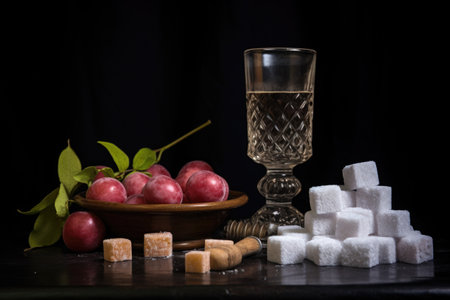 dumbbell and sugar cubes arranged in a still life on a dark background