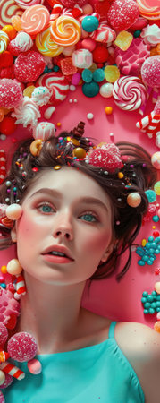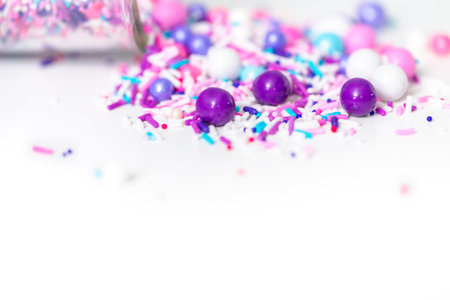 Macro shot of colorful hard candies with sparkling sugar crystals, captured in a bright and cheerful setting. Perfect for sweet and festive themes.