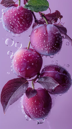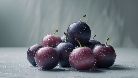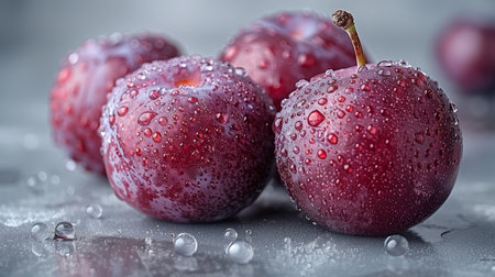 Close-up of fresh, ripe plums glistening with water droplets. Captures the beauty and freshness of these juicy fruits, perfect for showcasing healthy eating and summer flavors.