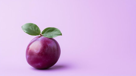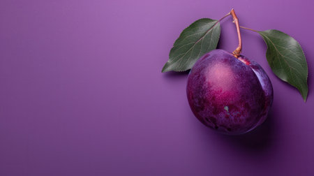 A ripe plum with a single leaf attached rests on a plain, purple background. The plum is vibrant purple with a hint of red and a glossy sheen. The image is a still life with a focus on the plum.