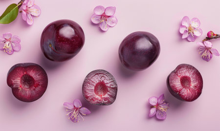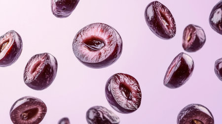 Suspended slices of plums are artistically displayed against a soft pink background, highlighting their smooth texture and rich purplish-red hue. This arrangement captures their freshness and appeal.