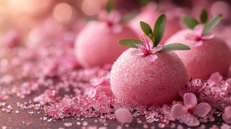 A luxurious setup featuring pink bath bombs surrounded by delicate floral petals, exuding elegance and relaxation.