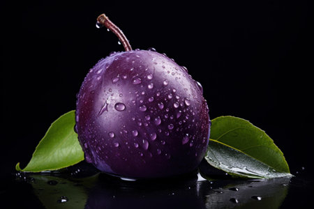Close-up of a juicy purple plum with dew drops surrounded by green leaves