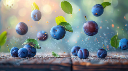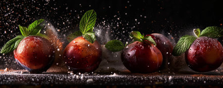 Vibrant purple plums dusted with shimmering sugar crystals, their succulent flesh inviting indulgence or nutritious bites, set against a fresh, appetizing backdrop.