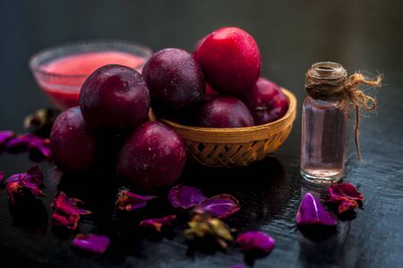 Raw organic red ripe plums in a brown-colored basket along with its extracted essential oil in a transparent glass bottle along with its paste in another glass bowl.