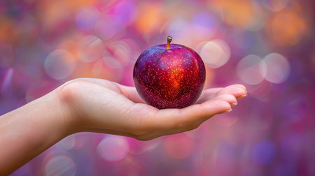 Close up of hand holding ripe plum with blurred plum selection background and copy space