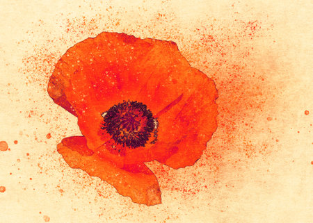 Bright red wild poppy flower, paper texture background, photomanipulation, digital watercolor effect.