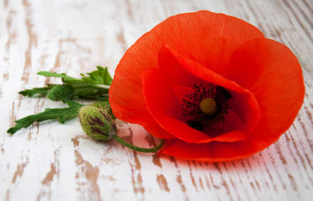 Red poppy flower on a dark wooden background. Bouquet of red flowers with selective light.