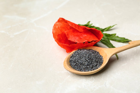 Spoon of poppy seeds and flower on light table, space for text