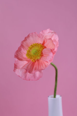 Beautiful poppy flower in vase on pink background, closeup