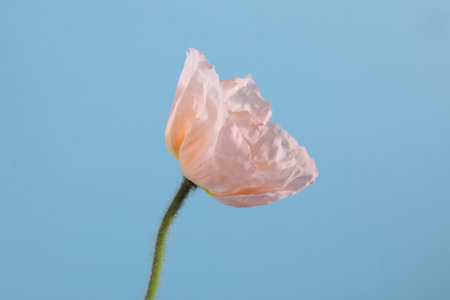 One beautiful poppy flower on light blue background, closeup