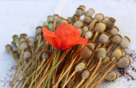 drug production concept: flowers and opium poppy heads next to packages of heroin, soft focus, toning, blur