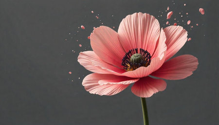 Elegant pink poppy with floating liquid drops on gray