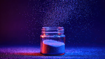A mesmerizing image featuring a jar filled with powder, illuminated by vibrant blue and purple lights, creating an enchanting sparkly effect.