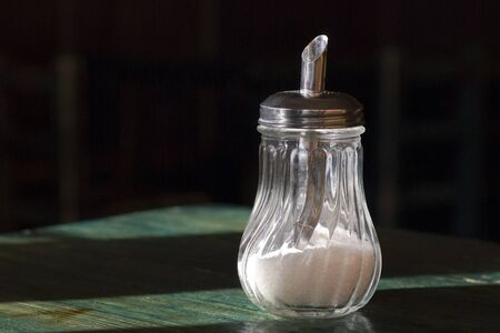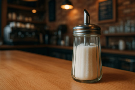 Jar for loose sugar with a dispenser on a wooden bar counter