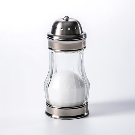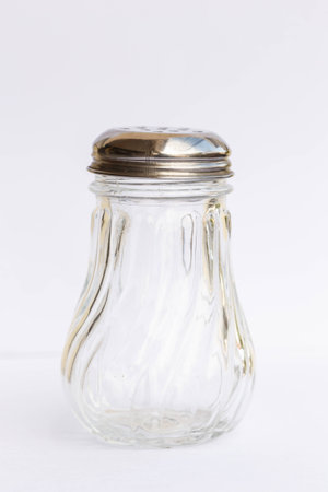 A glass salt shaker with a metal lid on a white background, showing its transparent design and minimalistic elegance for kitchen use.