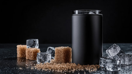 A sleek black tumbler is elegantly placed amongst cubes of ice and brown sugar, creating a captivating still life that embodies sophistication and modern design.