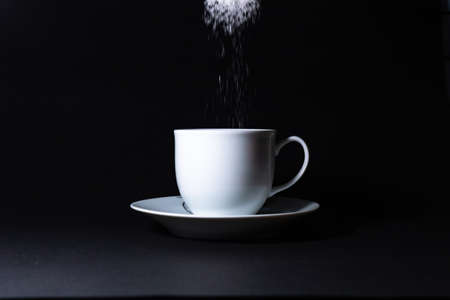 adding sugar in a cup on black background