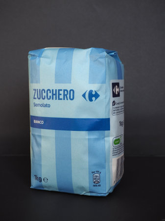 ANNECY, FRANCE - CIRCA FEBRUARY 2020: Carrefour white sugar packet