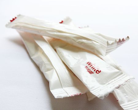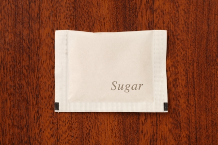 Sugar cubes in the paper pack on the table. Throw away, do not eat excessive sugar intake health warning on the packet.