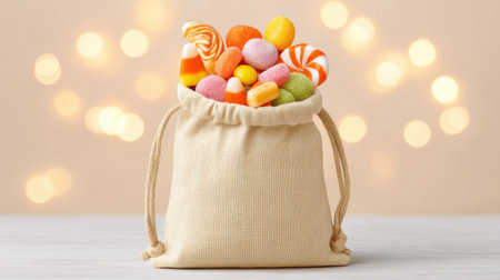 A charming textile bag filled with an assortment of vibrant candies, creating a joyful and inviting atmosphere, perfect for celebrations and sweet moments.