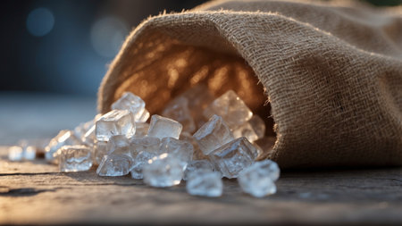 AI Generated. Raw ice spilling out of a burlap canvas sack