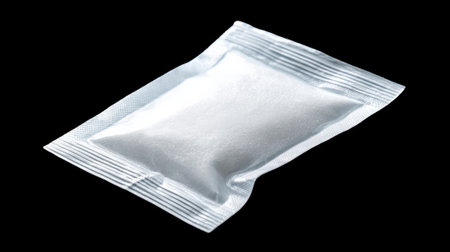 High-angle shot of white sugar spilled from a paper packet onto a clean table, with copy space