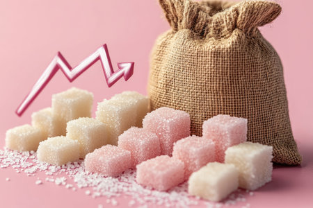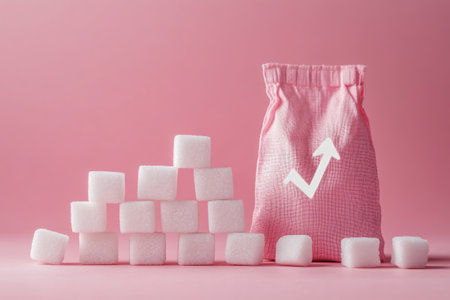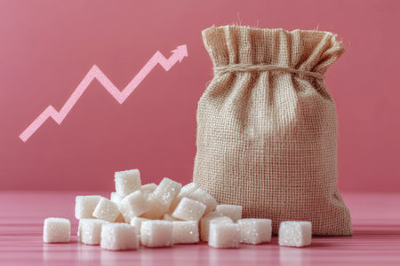 Sack overflowing with sugar cubes with an upward trend arrow symbolizing increasing sugar consumption