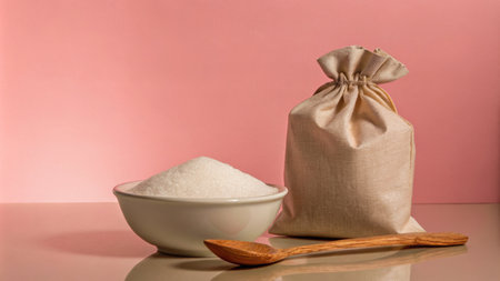 Bowl of Sugar with Sack and Spoon on a Pink Background