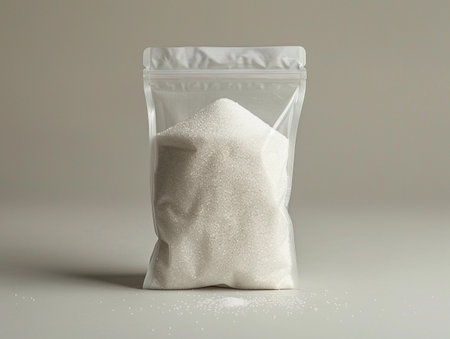 Close-up of a transparent plastic bag filled with white sugar on a neutral background.
