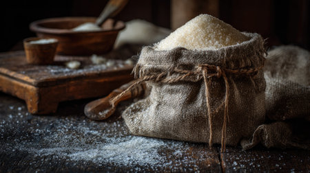 Overflowing bag of granulated white sugar in a rustic kitchen setting, styled for authenticity and warmth