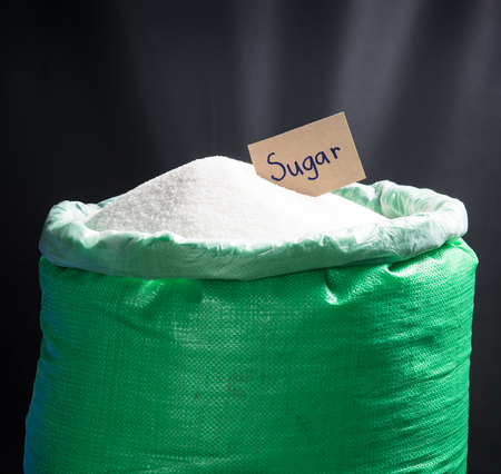 Sack with sugar and transparent plastic orange scoop on extra-strong paper background
