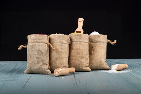 Rice in sacks on a wooden table. Selective focus. Toned.