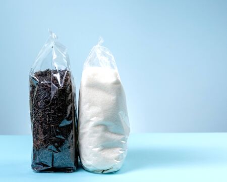 Tea, sugar and sweets as Donation food on a blue light background. Copy space for text.