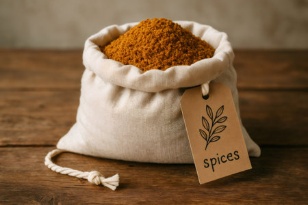 Brown spices nestled in a reusable linen pouch, complete with a label and string, resting on a rustic wooden table