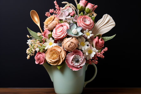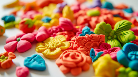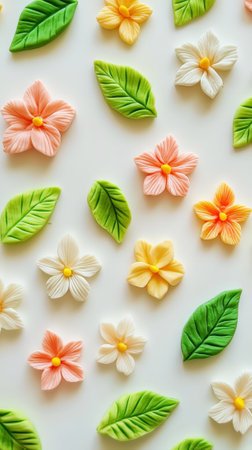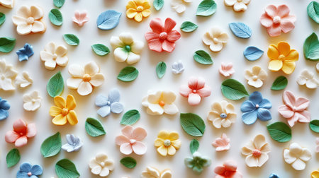 Floral pattern featuring delicate flowers made of polymer clay in pastel colors. Light background. Generative AI.