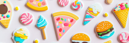 A delightful assortment of playful food stickers showcases pizza slices, ice creams, and candies filling a light background, perfect for decoration.