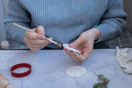 Unrecognizable artist do it yourself air dry clay crafts for Christmas tree decor holiday. Decoration gift idea Handmade children craft. Step by step instruction of painting