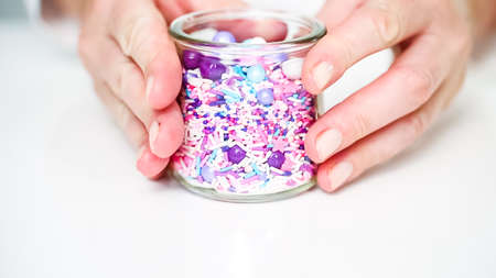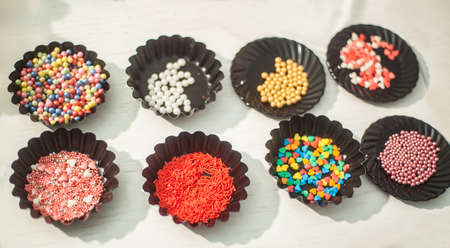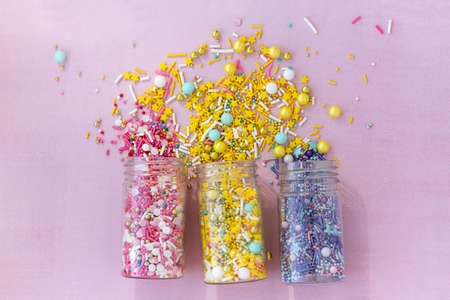 Various sugar sprinkles grainy, close-up flat lay