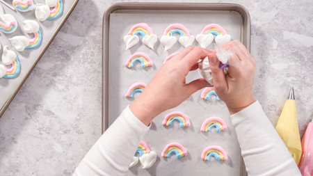 Flat lay. Step by step. Piping meringue mix into unicorn-shaped pops on a baking sheet lined with parchment paper.