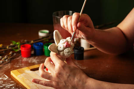 The artist paints religious objects. Easter bunny prepared for coloring is lying on the board. Branches of willow and lilac with blooming green leaves. Paint in jars, tubes with brushes and a glass of water. Hands close up.