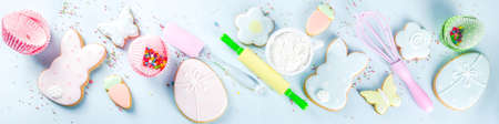 Easter cookies, ingredients and utensils for easter baking - eggs, flour, sugar, butter, milk on a light blue background.Top view copy space for text.