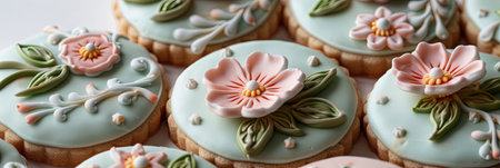Intricate floral cookie design with delicate icing and edible flowers on wooden table.