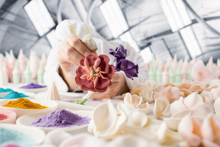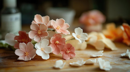 Sugar flowers delicately crafted for cake decoration, arranged on a workbench