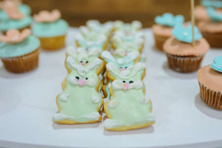Close-up candy bar from white blue turquoise cookies bunny stile and cupcakes