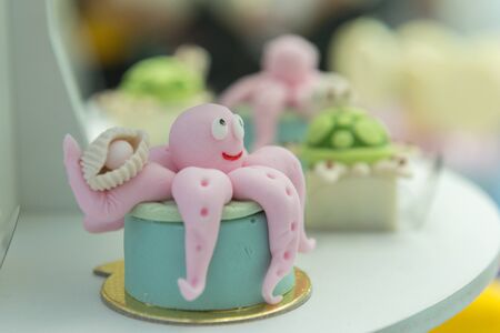Children's party decor on The Seabed theme. Personalized octopus candy. Children's party decorated with personalized candies. Children's birthday party.
